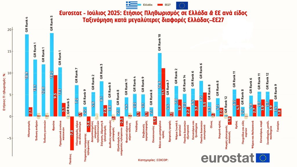 Τα νεότερα στοιχεία της Eurostat για τον πληθωρισμό Ιουλίου 2025 δεν αφήνουν περιθώρια παρερμηνειών: η Ελλάδα παραμένει μια από τις ακριβότερες χώρες της Ευρωπαϊκής Ένωσης. Και μάλιστα, όχι τυχαία· οι αυξήσεις στις τιμές βασικών αγαθών και υπηρεσιών είναι πολλαπλάσιες σε σχέση με τον ευρωπαϊκό μέσο όρο.